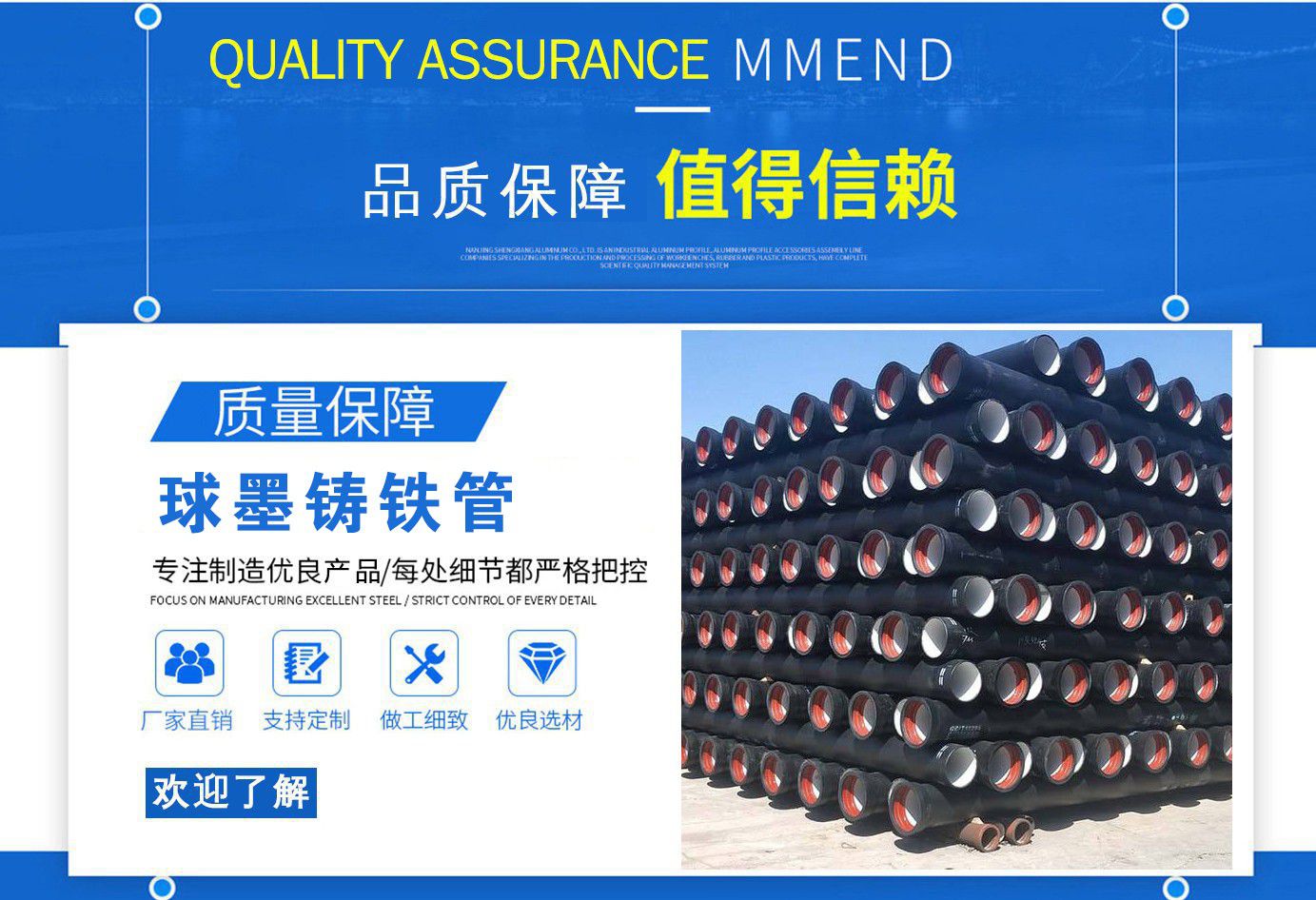 山西飛翔鑄業(yè)有限公司是一家以新興技術(shù)致力于研制開發(fā)、生產(chǎn)、銷售、施工安裝各種球墨管廠家,球墨鑄鐵管價格,國標球墨管,k9球墨鑄鐵管,國標球墨鑄鐵管,離心球墨鑄鐵管等系列鑄鐵產(chǎn)品。公司擁有完善的銷售、售后服務(wù)體系及一支由鑄造專家、工程師組成的精通產(chǎn)品設(shè)備和生產(chǎn)鑄造的技術(shù)力量隊伍。隨著企業(yè)的發(fā)展,我們積累了豐富的鑄造經(jīng)驗與科技水平。使得產(chǎn)品具有高強度、高韌性、耐腐蝕性強等性能。同時,我們獲得質(zhì)量管理體系認證、產(chǎn)品質(zhì)量認證、職業(yè)健康體系認證、環(huán)境管理體系認證。產(chǎn)品暢銷各地并打入韓國、新加坡等東南亞市場。 在未來的發(fā)展中,公司奉行誠信共雙贏,合作創(chuàng)盛世的企業(yè)理念。讓我們一起共創(chuàng)美好未來! 公司產(chǎn)品采用良好的工藝流程,以確保產(chǎn)品質(zhì)量的穩(wěn)定性:以良好的設(shè)備,確保質(zhì)量的可靠性。廣泛應用于國內(nèi)外城市的市政建設(shè),通信,自來水,消防,園林,環(huán)保等行業(yè),產(chǎn)品大獲贊譽! 我們有多年的井蓋生產(chǎn)經(jīng)驗,多名老技術(shù)工人有將近二十年的生產(chǎn)經(jīng)驗,還聘請多名新技術(shù)研發(fā)人員,因為我們始終堅信質(zhì)量才是未來生存的根本,只有把質(zhì)量保證了,企業(yè)才會有更加美好的未來。公司堅持用心服務(wù),誠信為本,與時俱進,科技為先的企業(yè)理念,堅持科技先導、竭誠為廣大用戶服務(wù)。歡迎各界朋友蒞臨我公司參觀,指導洽談業(yè)務(wù),相信選擇我們就是選擇我們共贏的明天...